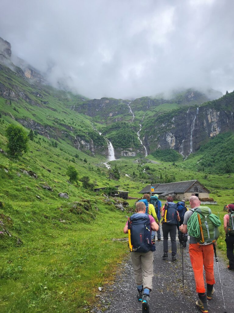 Die SBB brachte alle Teilnehmerinnen und Teilnehmer von den verschiedenen Ausgangsorten pünktlich an den Treffpunkt in Glarus. Das Alpentaxi brachte uns bei teilweise starkem Regen zur Alp Chäseren. Ab hier wanderten wir gemütlich bei angenehmen Temperaturen und ohne Regen zur Glärnischhütte. Nach einer Stärkung vom Kuchenbuffet wurden wir in drei Seilgruppen aufgeteilt und übten die Seiltechnik für den nächsten Tag.