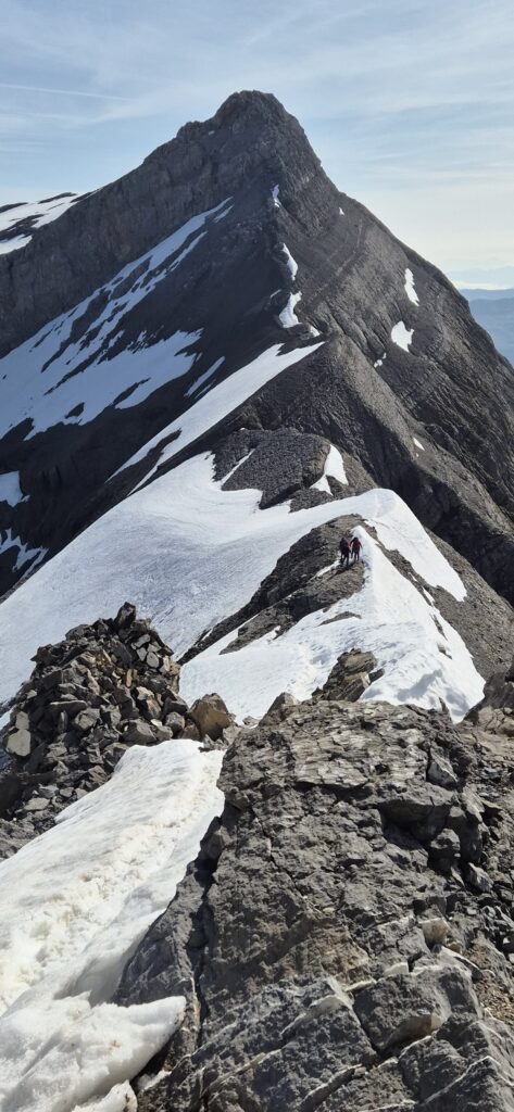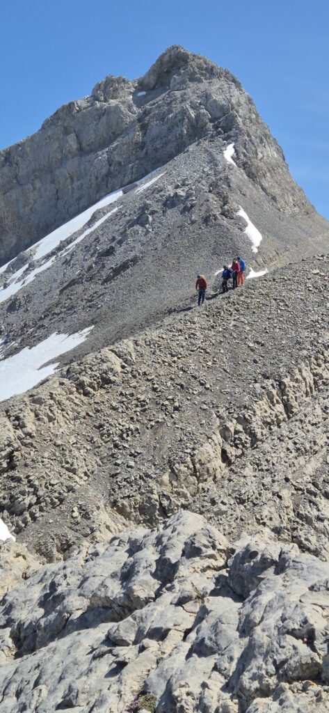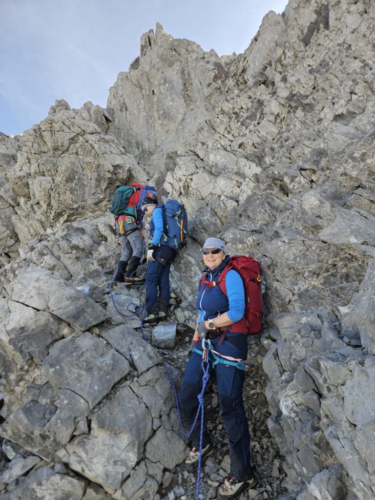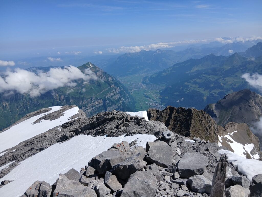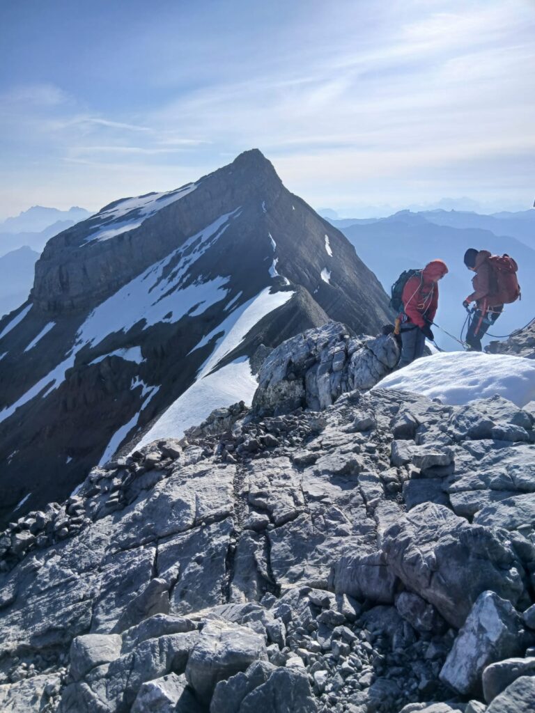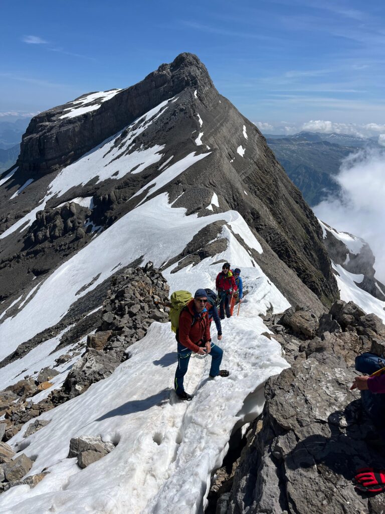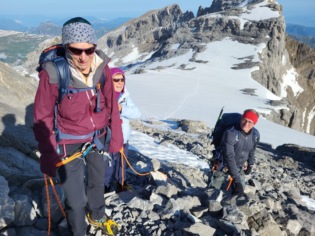 Kurz vor 8:00 Uhr erreichten wir die Abseilstelle, an der wir uns kurz ausruhten und umseilten. Die Kletterpartie zum Grat aufs Vrenelisgärtli war herausfordernd; erst im dritten Anlauf gelang es der Seilschaft mit den kürzesten Beinen, den Abstieg zu meistern. Der Weg über den Grat zum Gipfel war einfacher, und gegen 10:00 Uhr standen wir oben. Wir gönnten uns eine wohlverdiente Pause und tankten neue Energie für den bevorstehenden langen Abstieg.
