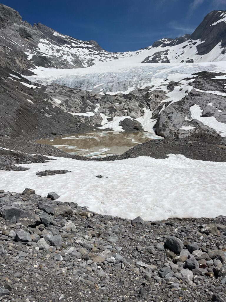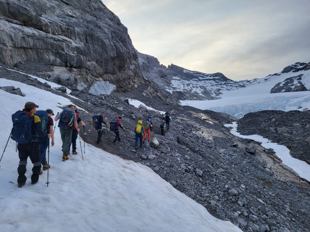 Schon bald standen wir wieder an der Abseilstelle, die es nun hochzuklettern galt. Je nach Beinlänge ging dies schneller oder langsamer. Oben angekommen montierten wir erneut die Steigeisen und seilten uns um für den Abstieg über den Glärnischfirn, der nun bei weichem Schnee rasant verlief. Wieder auf dem Schotter angekommen, legten wir Steigeisen, Gstältli und Jacken ab und machten uns auf die Suche nach unseren Wanderstöcken, die wir deponiert hatten.
