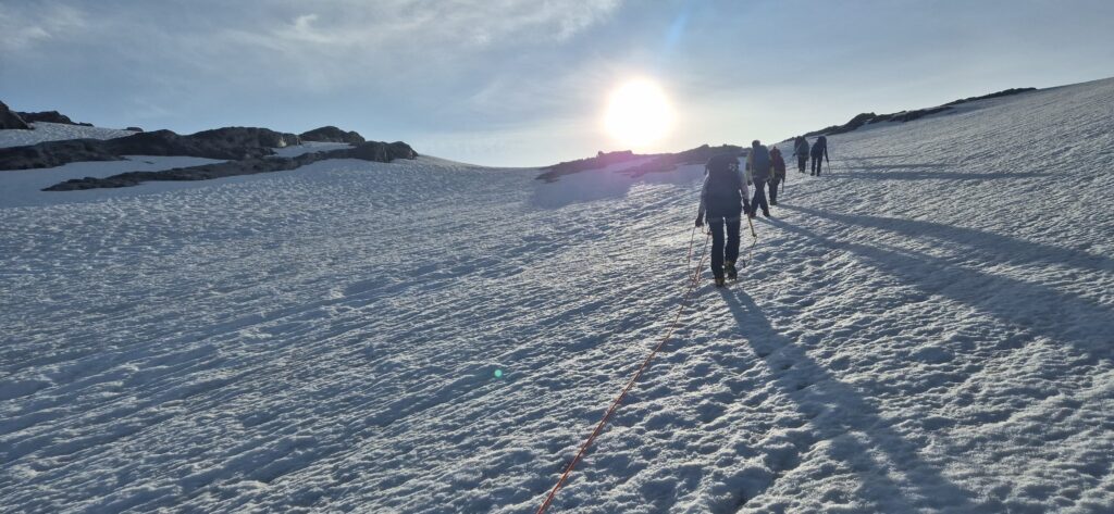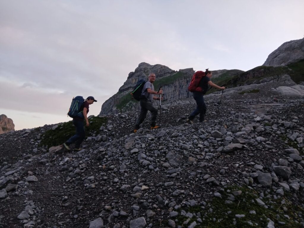 Am zweiten Tourentag ging es früh los. Um 4:00 Uhr gab es Z’Morge, und um 4:45 Uhr war bereits Abmarsch von der Glärnischhütte. Bei den ersten Anzeichen von Tageslicht liefen wir, teils noch etwas schläfrig, los in Richtung Glärnischfirn. Schon bald wurden die Stirnlampen versorgt, und die ersten Sonnenstrahlen küssten die Gipfel um uns herum.