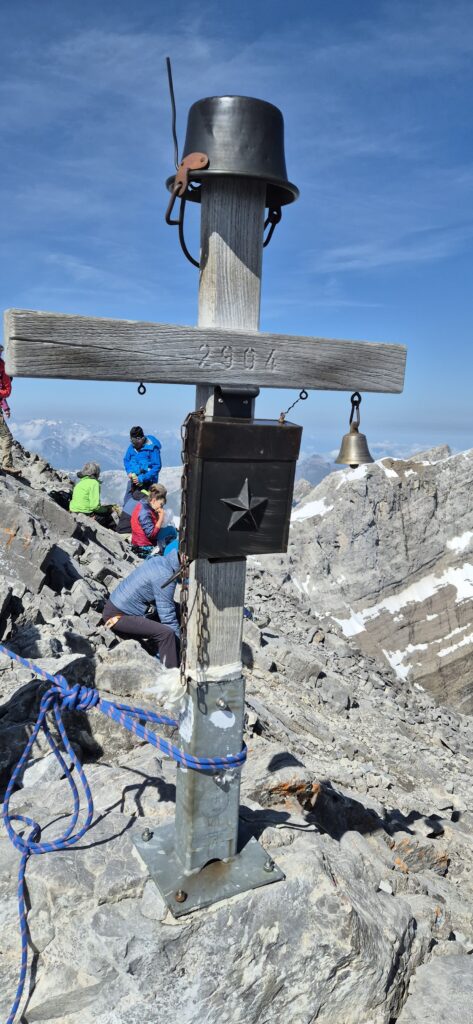 Nach fast 24 Stunden ohne Netz konnten viele nicht wiederstehen, die Verbindung auf dem Gipfel zu nutzen und ein Lebenszeichen ins Tal zu schicken. Nach Sonne, Verpflegung und dem obligatorischen Gipfelfoto machten wir uns nach etwa einer Stunde wieder an den Abstieg.