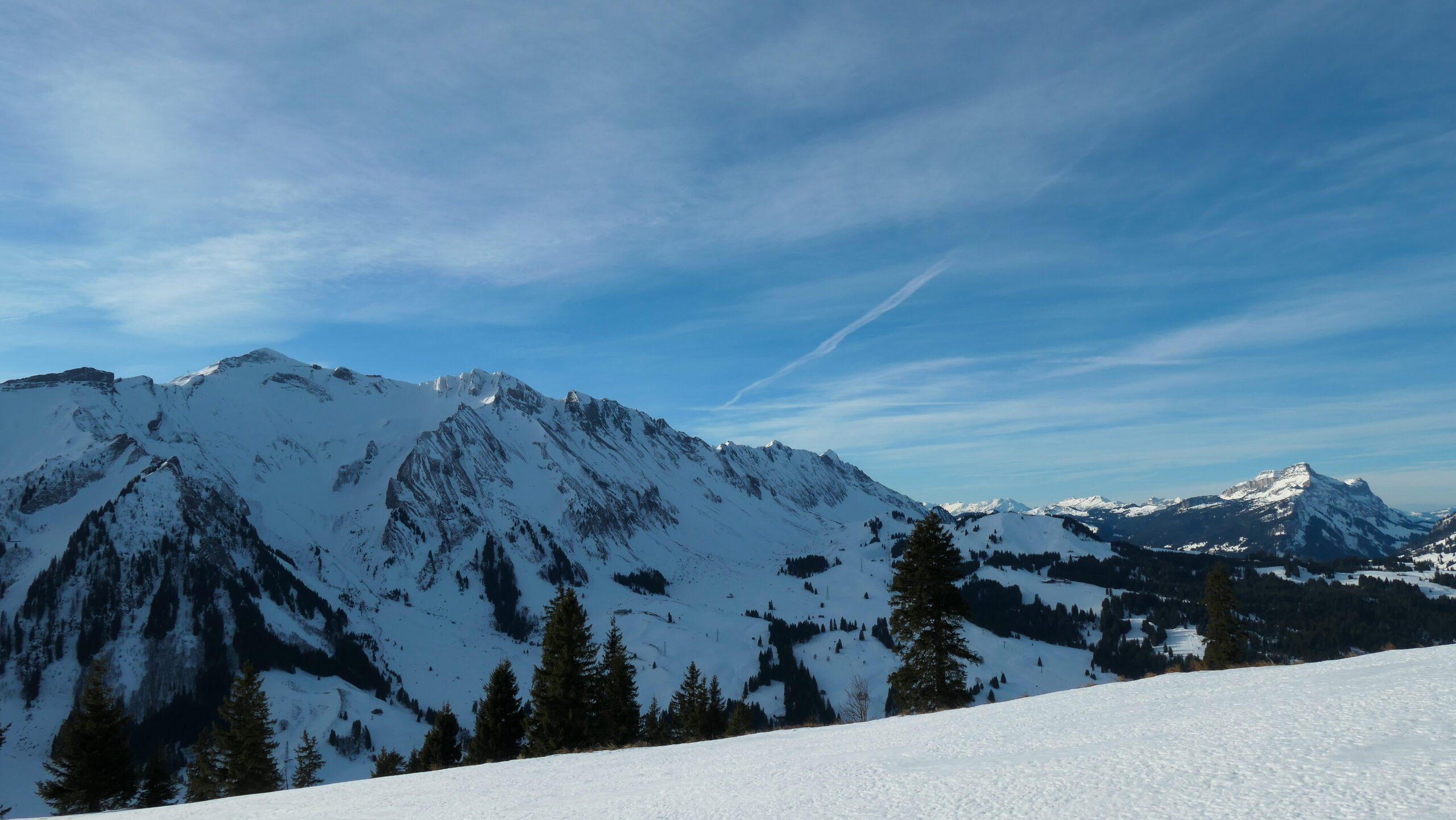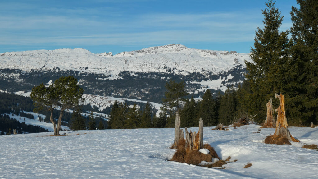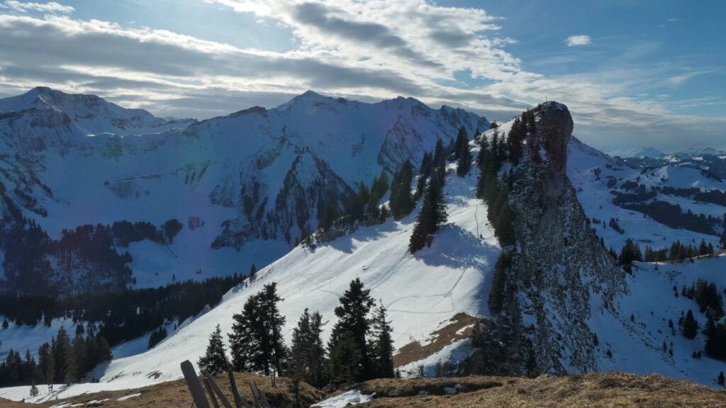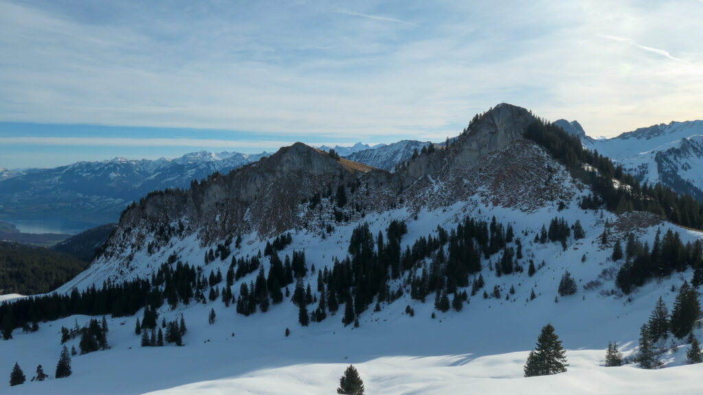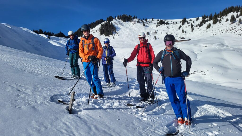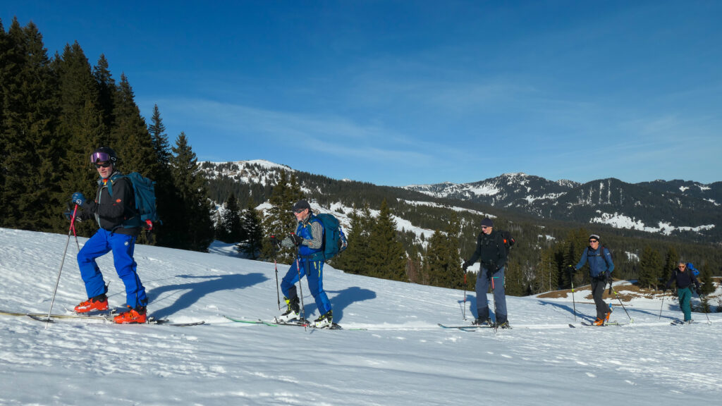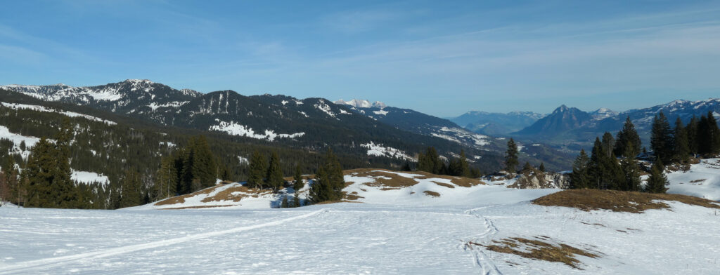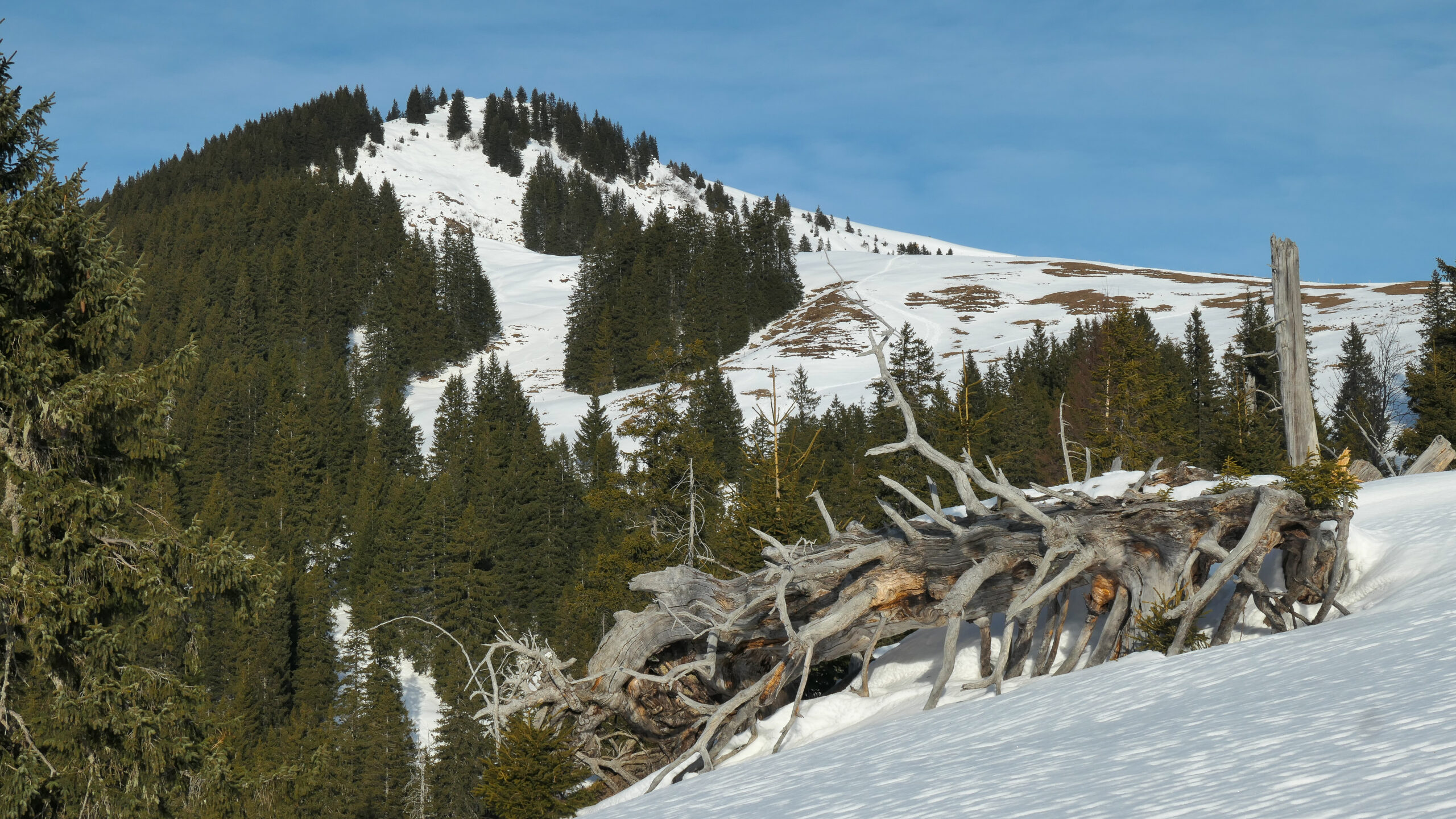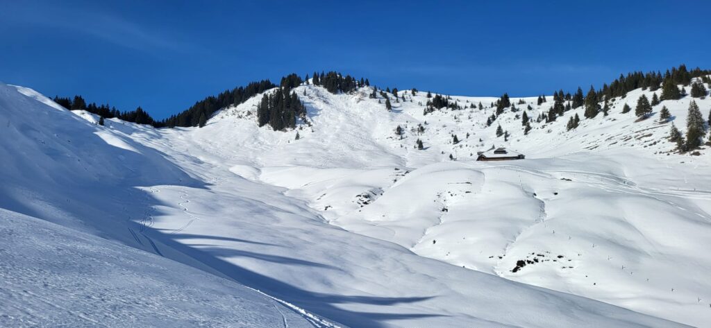 Nach der Gipfelrast kurven wir hinunter in Obwaldnerische. Es geht ganz ordentlich, mit mehr oder weniger Kraftaufwand und mit mehr oder weniger schönen Schwüngen. Ja, eigentlich ist der Schnee ganz in Ordnung. Nur die Skitechnik könnte ich noch etwas verbessern. Jedoch geht es immer besser und viel zu früh endet die Abfahrt am Waldrand unterhalb der Alp Schwander Unterwengen.