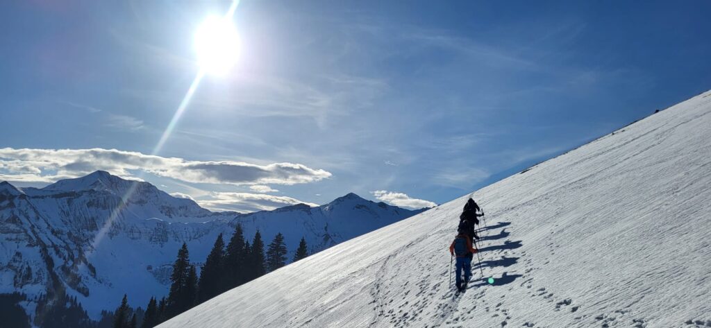Wir fellen wieder auf und steigen hinauf gegen die Alphütte und folgen der Strasse zur Ribihütte. Zum Glück sind die steilen Hänge über uns bereits entladen und so besteht für uns keine Gefahr mehr. Von der Ribihütte aus gehen wir noch hoch zum Grat oberhalb des Chalberbodens. Hier geniessen wir die Aussicht auf die Rothornkette, den nahen Rotspitz und natürlich auf unsere Abfahrtsspuren vom Nünalpstock.