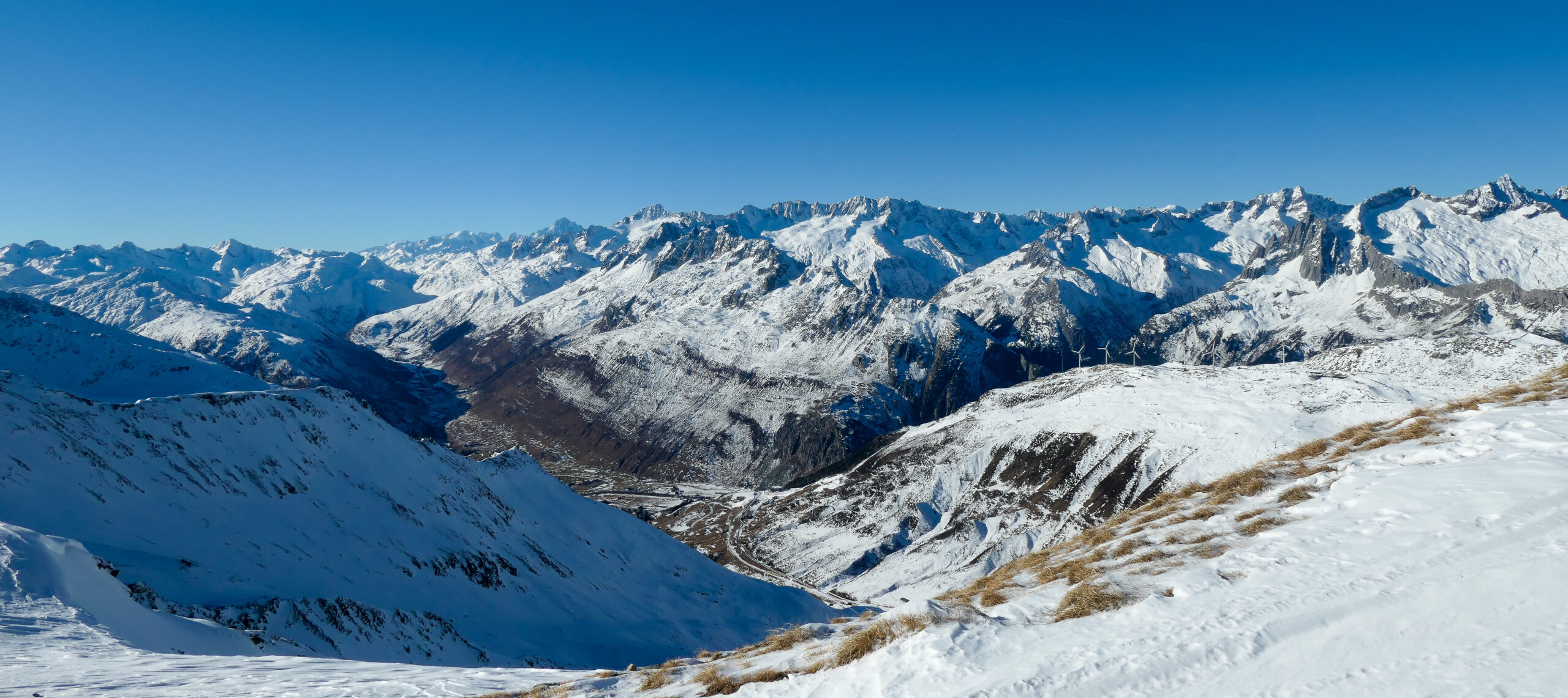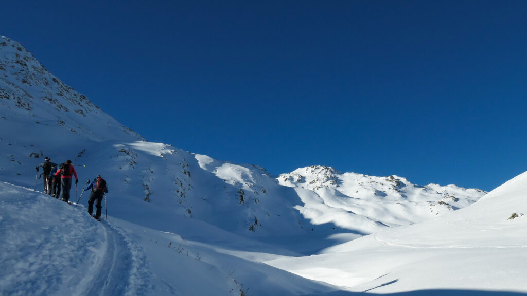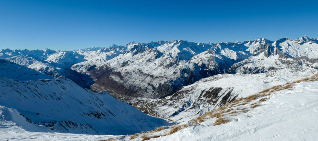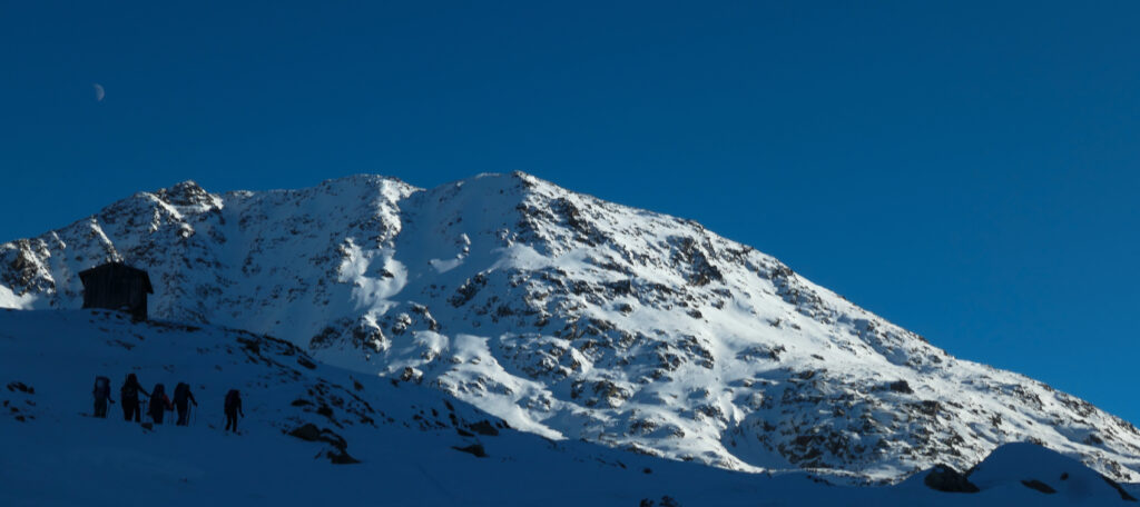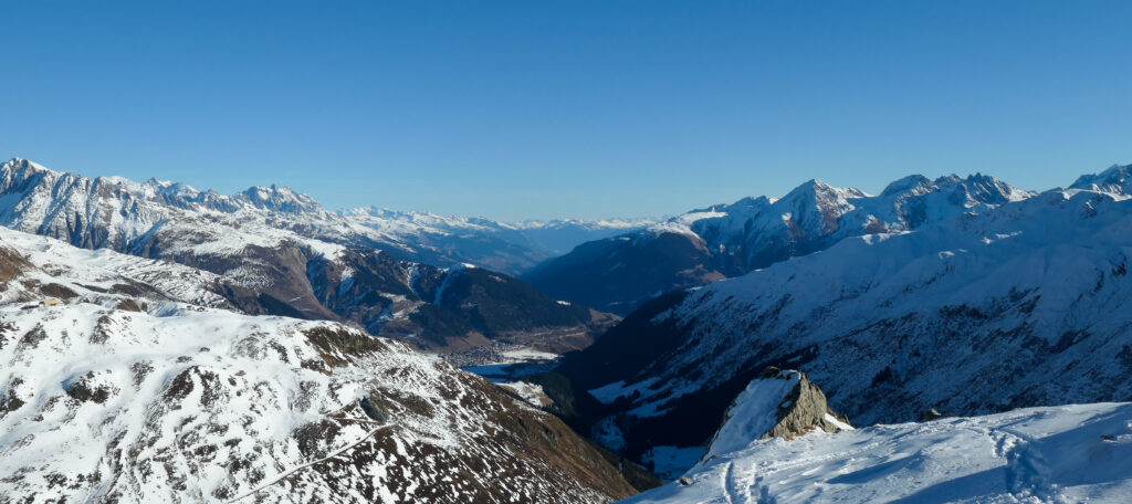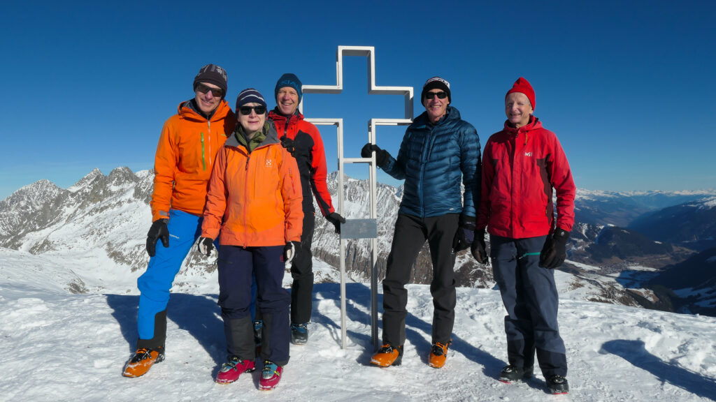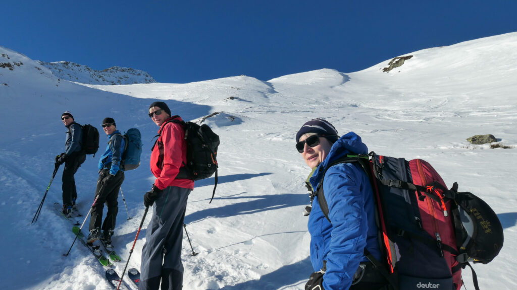 Nach einem Kaffeehalt im Bahnhofbuffet Andermatt fahren wir zu fünft auf den Oberalppass, um dort die erste Skitour des ESV in diesem Winter zu starten. Vorbei am Leuchtturm geht es in guter Spur hoch gegen den Pazolastock. Beim Übergang auf die Ostseite müssen die Ski getragen werden. Das habe ich noch nie erlebt. Heiss brennt danach die Sonne in die steilen Hänge bis zum Südgrat und wir sind froh um das laue Lüftchen.