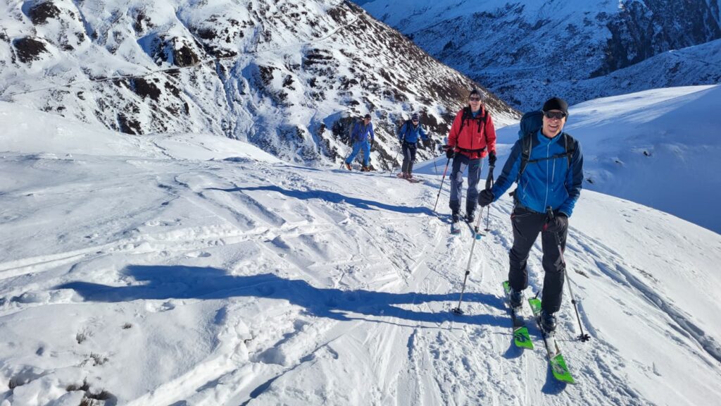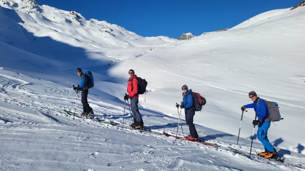 Auf dem Gipfel geniessen wir die herrliche Fernsicht (man sieht sogar bis Chur) und stärken uns für die Abfahrt. Ich bin etwas skeptisch. Was erwartet uns? Beim Aufstieg hatte es nicht immer allzu viel Schnee und auch seine Konsistenz war nicht über alle Zweifel erhaben.